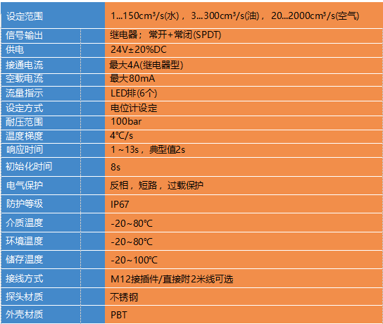 无活动部件 ,免维护 ,安装方便 ,一种型号适用于多种管径要求 ,开关量连续可调, 极低的压力损失 ,结构紧凑 , LED显示流动趋势及开关状态。温度信号可选配柜装式控制 表。